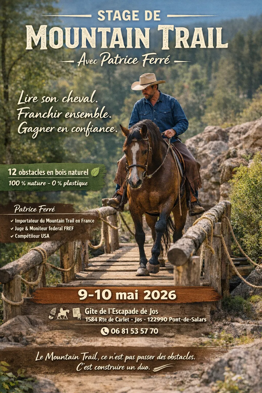 Stage de Mountain Trail avec Patrice FERRE. Travail progressif dans la lecture du cheval. Vous apprendrez les techniques pour franchir les obstacles, les explications sur la philosophie du Mountain Trail et ses règles. Patrice FERRE est l’importateur de la discipline en France. Compétiteur aux Etats unis il est également juge Mountain Trail, Formateur FREF, Moniteur Fédéral FREF de Mountain Trail et Guide de Randonnée FREF.